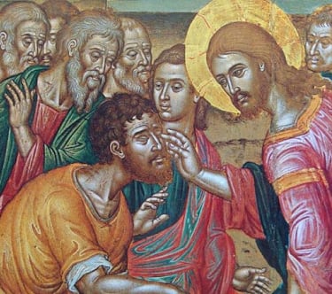 Почему Христос использует слюну? В другом месте (Ин. 9) Он смешивает слюну с землёй (брéнием) и мажет глаза слепорождённому.