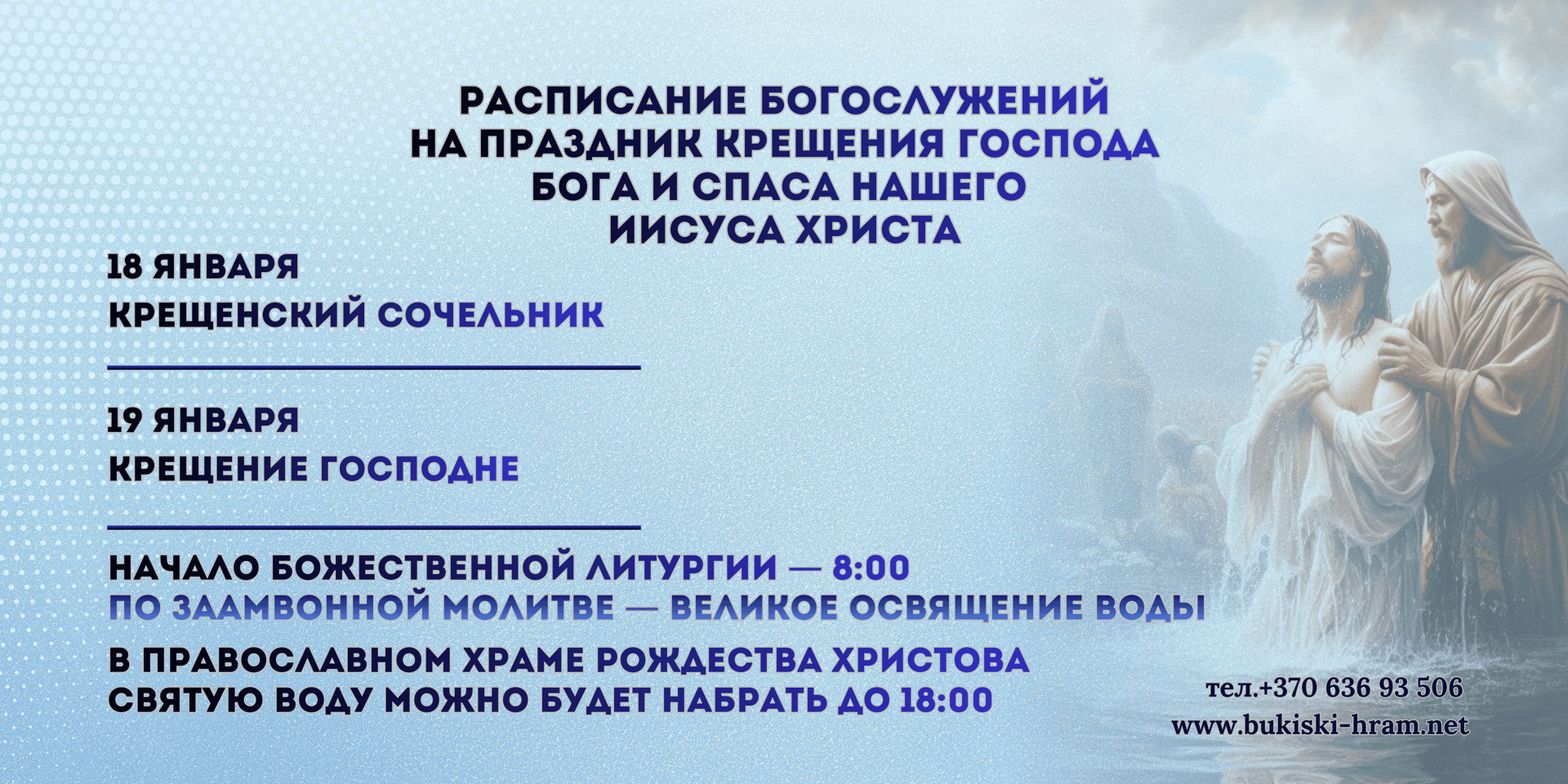 Сердечно приглашаем вас разделить молитвенную радость праздника Крещения Господня — дня Богоявления, когда Господь Иисус Христос входит в воды Иордана, освящая всё творение и открывая миру тайну Святой Троицы. Ниже приводим подробное расписание богослужений.