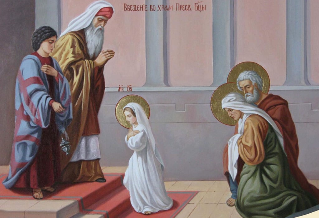 Введение во храм Пресвятой Богородицы совершилось, по Церковному преданию, следующим образом. Родители Девы Марии, праведные Иоаким и Анна, молясь о разрешении неплодства, дали обет, если родится дитя, посвятить его на служение Богу. Когда Пресвятой Деве исполнилось три года, святые родители решили выполнить своё обещание. Собрав родственников и знакомых, они повели свою дочь в Иерусалимский храм. Там встретил Богородицу первосвященник Захария, со множеством священников.